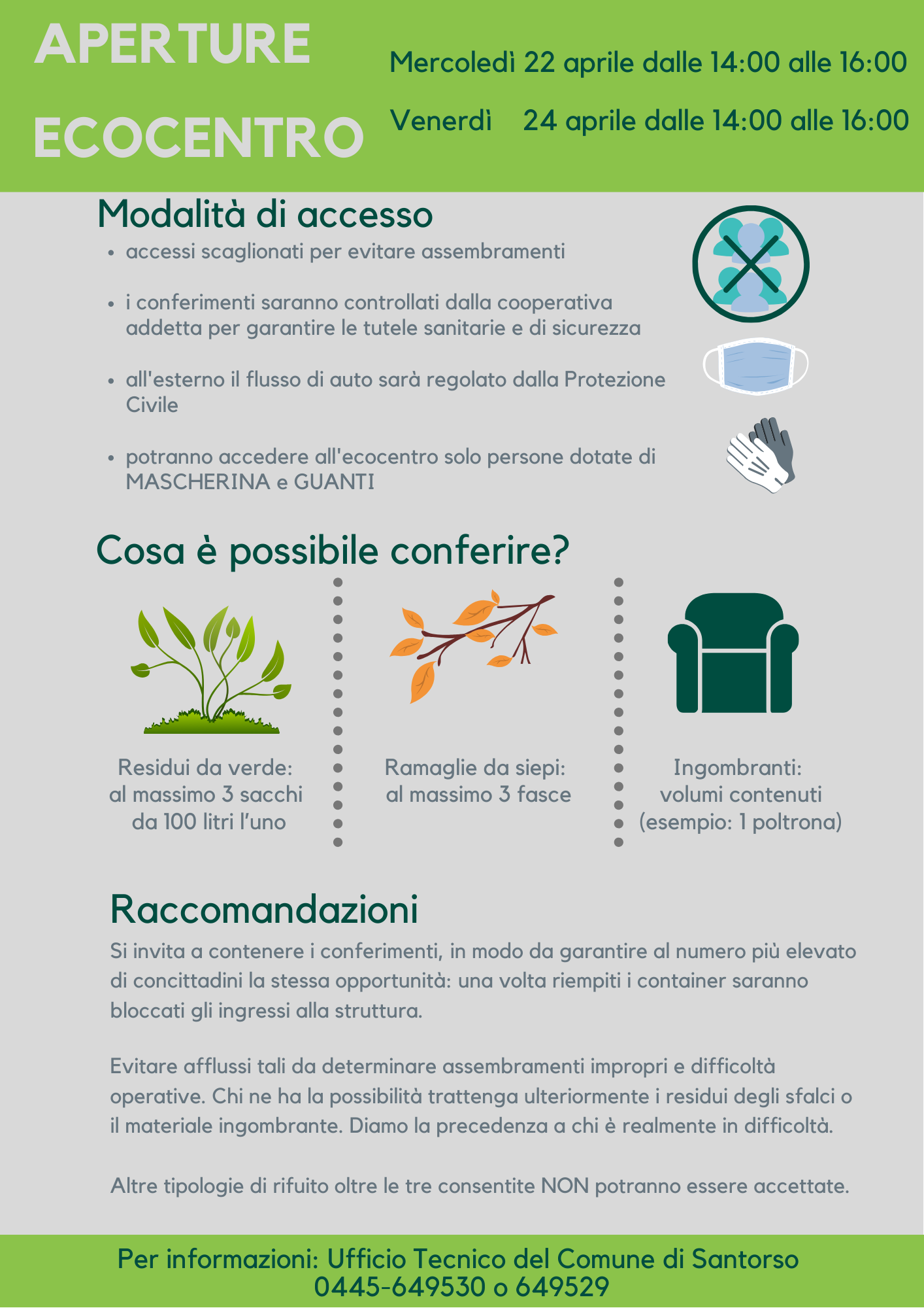 •  L’accesso all’ecocentro sarà consentito solo a chi sarà provvisto di mascherina protettiva e guanti. Chi si presenterà senza queste protezioni dovrà rientrare nella propria abitazione, senza alcuna possibilità di scarico del materiale.
