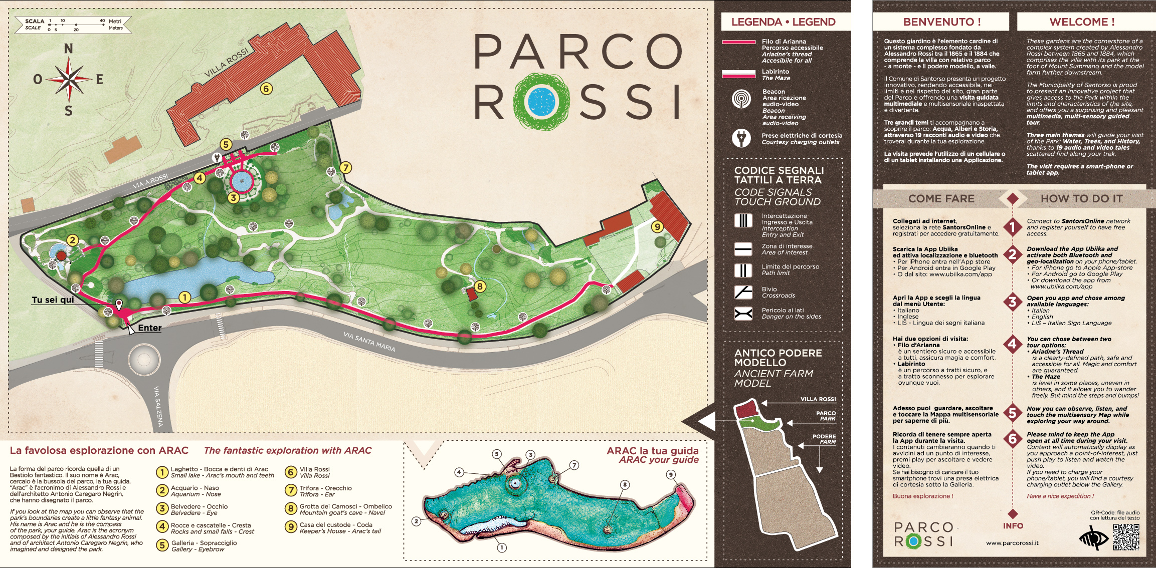 È prevista, per tutta la durata della visita, la presenza di “Arac” (un avatar che rappresenta la creatura fantastica di Parco Rossi) nella sua veste di anfitrione. Esso compare attraverso l’uso della realtà virtuale e dell’animazione facilitando il coinvolgimento del giocatore. Con il gioco il visitatore può diventare esploratore e a ogni meta raggiunta accumulare punteggi; la classifica potrà essere condivisa attraverso i social network. Il gioco prevede livelli di difficoltà diversi che tengono conto delle diverse tipologie di giocatori.