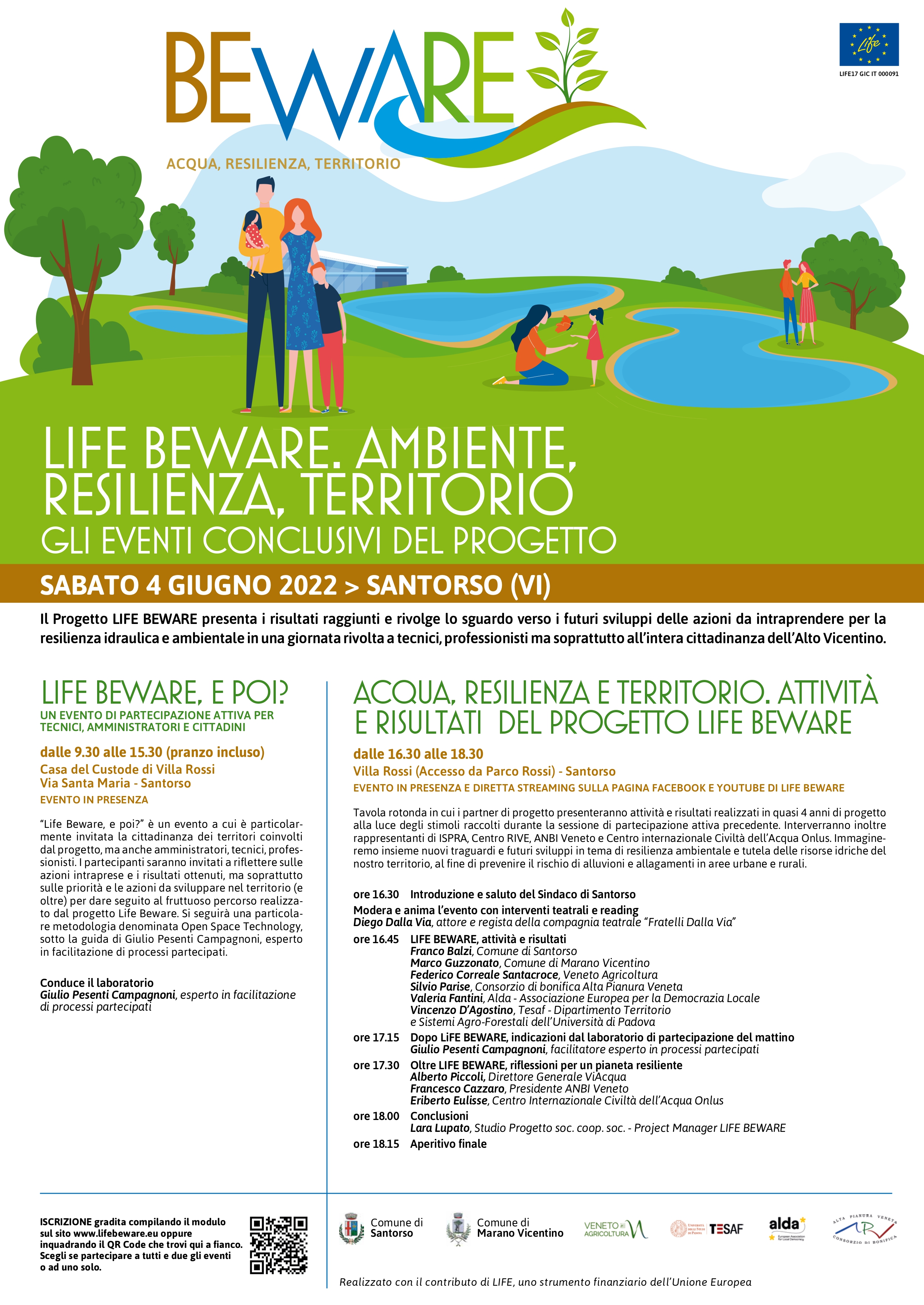 Tavola rotonda in cui i partner di progetto presenteranno attività e risultati realizzati in quasi 4 anni di progetto alla luce degli stimoli raccolti durante la sessione di partecipazione attiva precedente. Interverranno inoltre rappresentanti di ISPRA, Centro RIVE, ANBI Veneto e Centro internazionale Civiltà dell’Acqua Onlus e per immaginare insieme le azioni da intraprendere dopo la conclusione del Progetto in tema di resilienza ambientale e tutela delle risorse idriche del nostro territorio, al fine di prevenire il rischio di alluvioni e allagamenti in aree urbane e rurali.