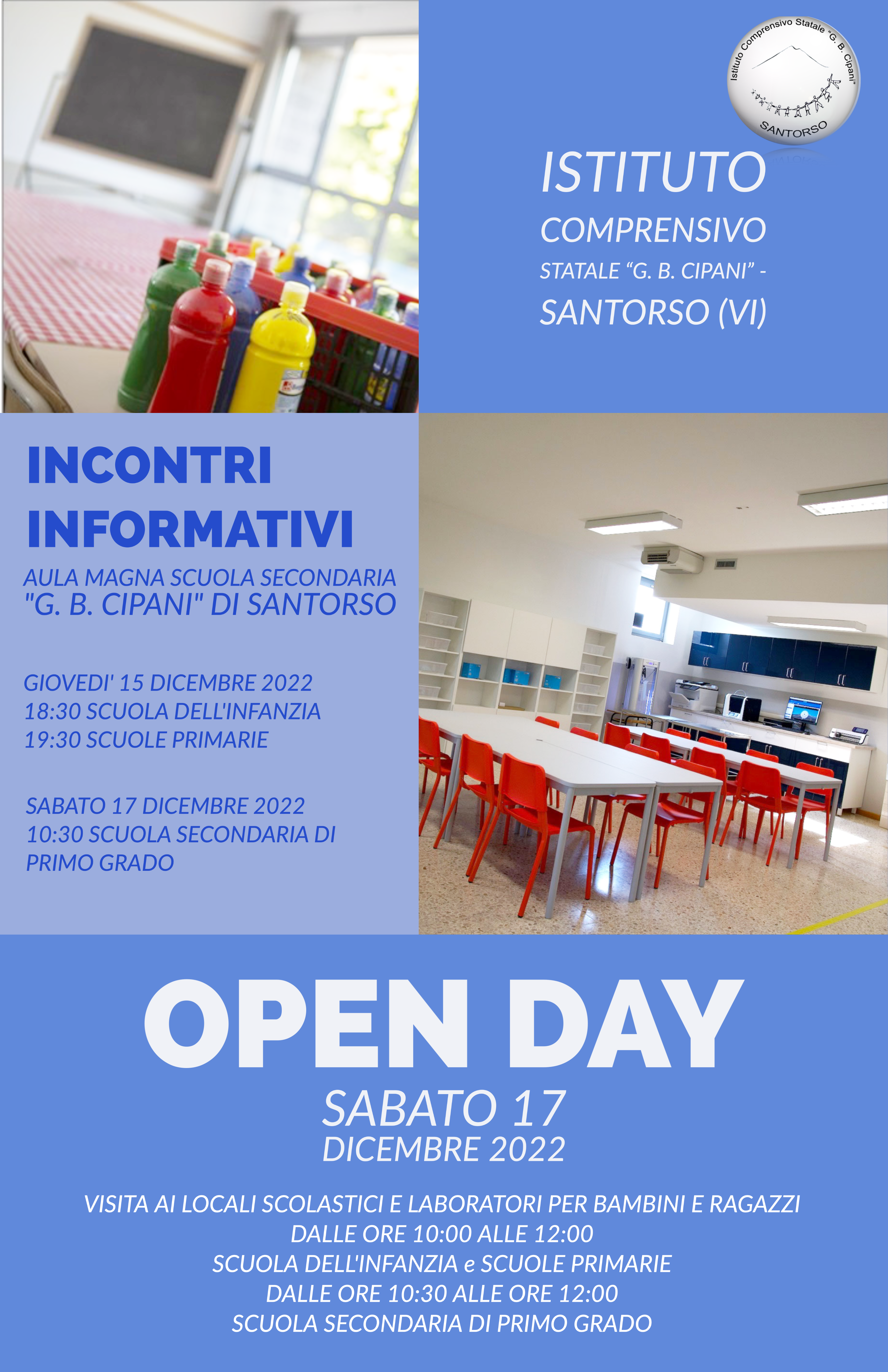 Open day Sabato 17 dicembreSCUOLE APERTEvisita il sito della scuolahttps://ics-santorso.edu.it/open-day-17-dicembre-2022/